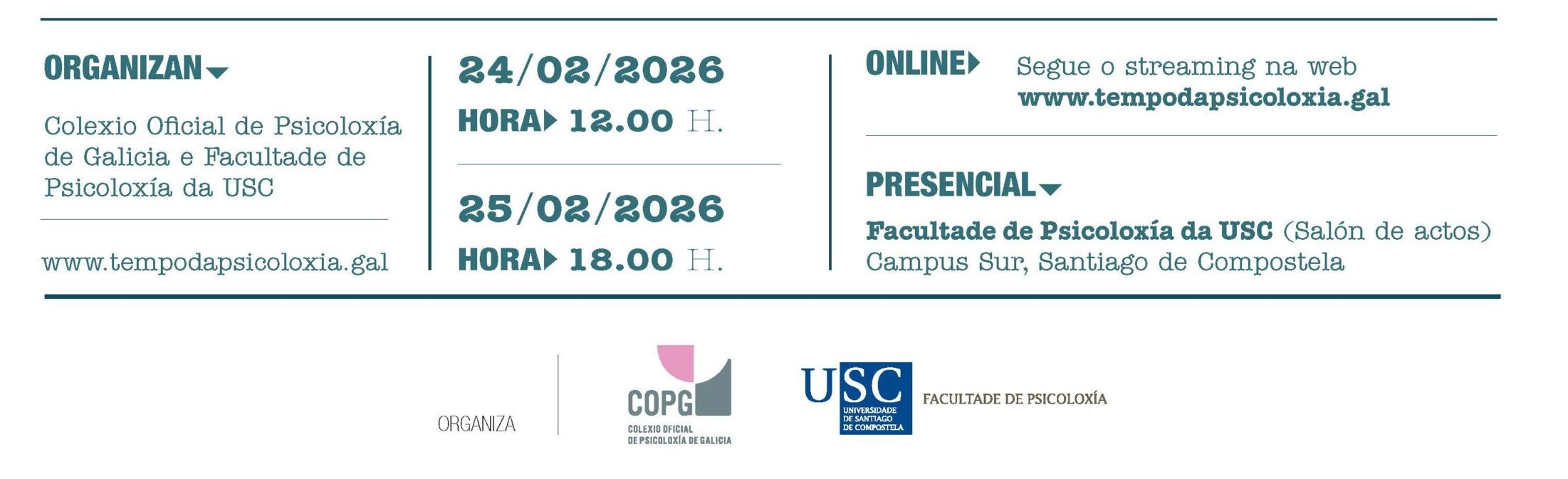 Desde 2019, febreiro é «Tempo da Psicoloxía». Ao longo dunha semana, podes asistir a distintas palestras nas que abordamos unha temática de actualidade en profundidade, con tempo e rigor. Abrimos un tempo no que a psicoloxía entra en diálogo con outras disciplinas profesionais e axentes sociais para ver como pode mellorar a vida das persoas e das comunidades a través da ciencia da psicoloxía.